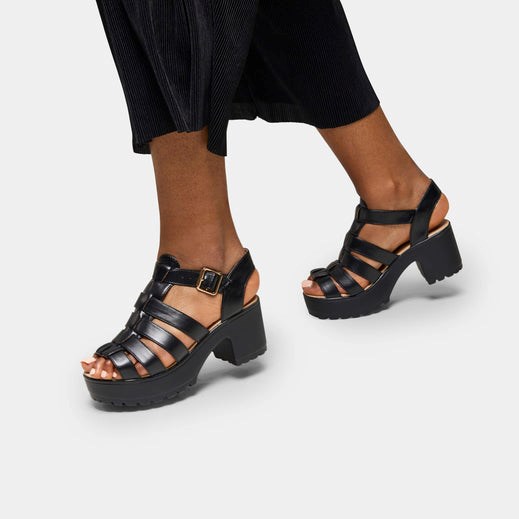 These Koi Footwear strappy sandals are a solid choice for summer. The Riakuma Croc texture looks more expensive than the price point suggests. The chunky heel provides decent comfort for walking, though I wish it were slightly more cushioned. Sizing runs true to EU standards – I ordered my usual size 38 and they fit perfectly. The black color is versatile and goes with everything. While not the most premium feel, they offer good value for money at around $52. Perfect for casual outings and beach days.