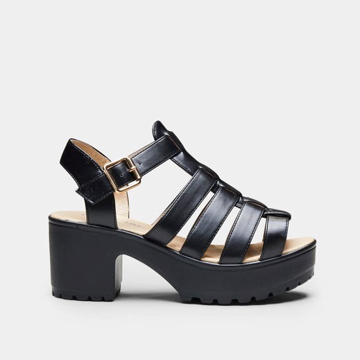 Koi Footwear women’s strappy sandals in black with Riakuma Croc styling. Features a comfortable chunky heel and stylish design. Includes free shipping and quality assurance.